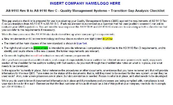 This gap analysis checklist is prepared for use in evaluating your Quality Management System (QMS) against the requirements of AS 9110 Rev