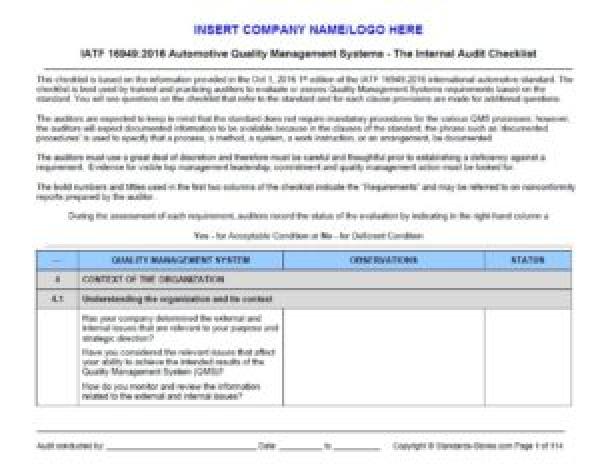 This checklist is based on the information provided in the Oct1, 2016 1st edition of the IATF 16949:2016 International Automotive Standard. The