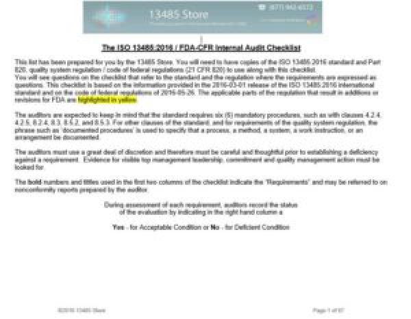 This list has been prepared for you by the 13485 Store. You will need to have copies of the ISO 13485:2016 standard and Part 820, quality system regulation / code of federal regulations (21 CFR 820) to use along with this checklist.